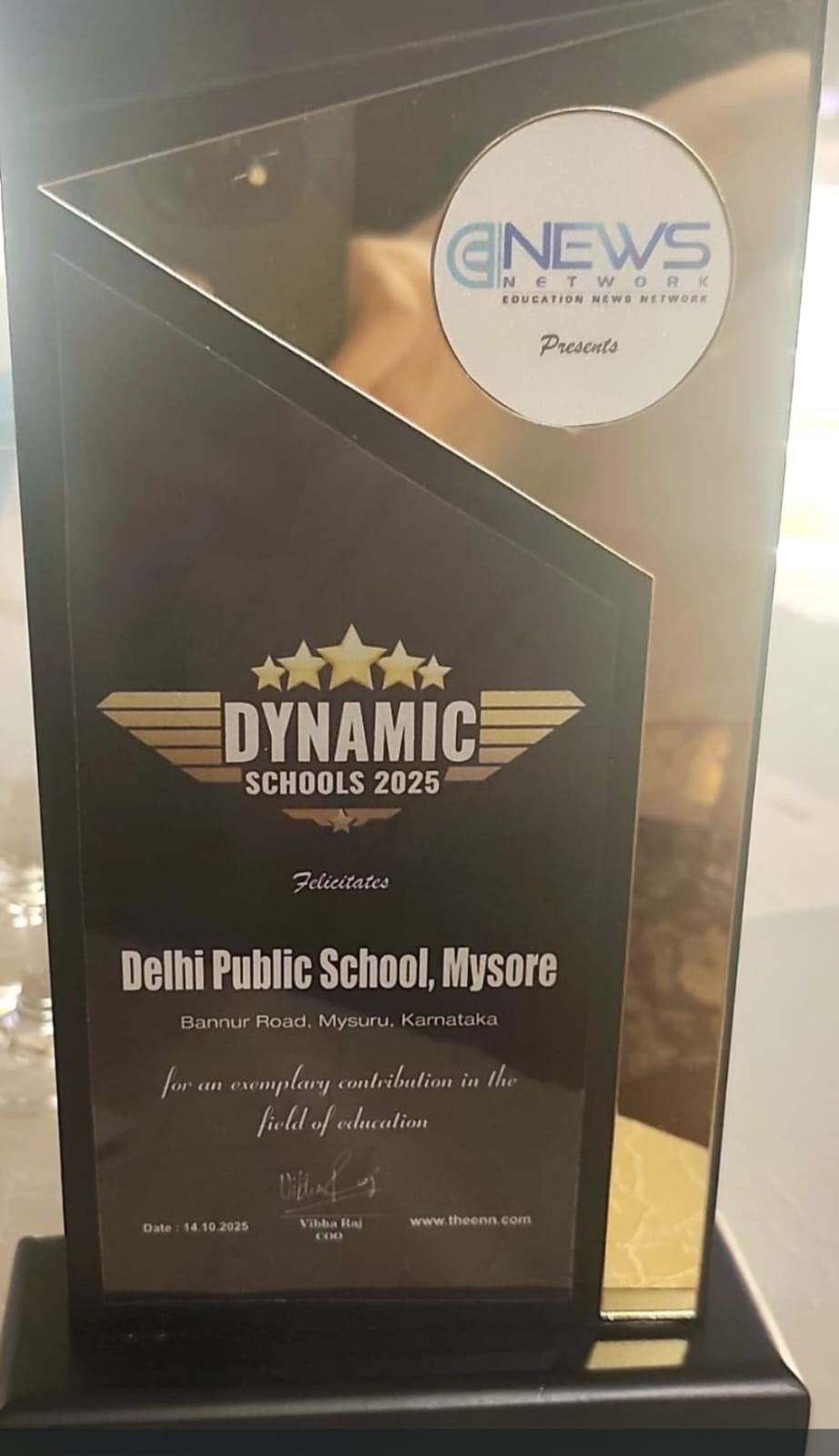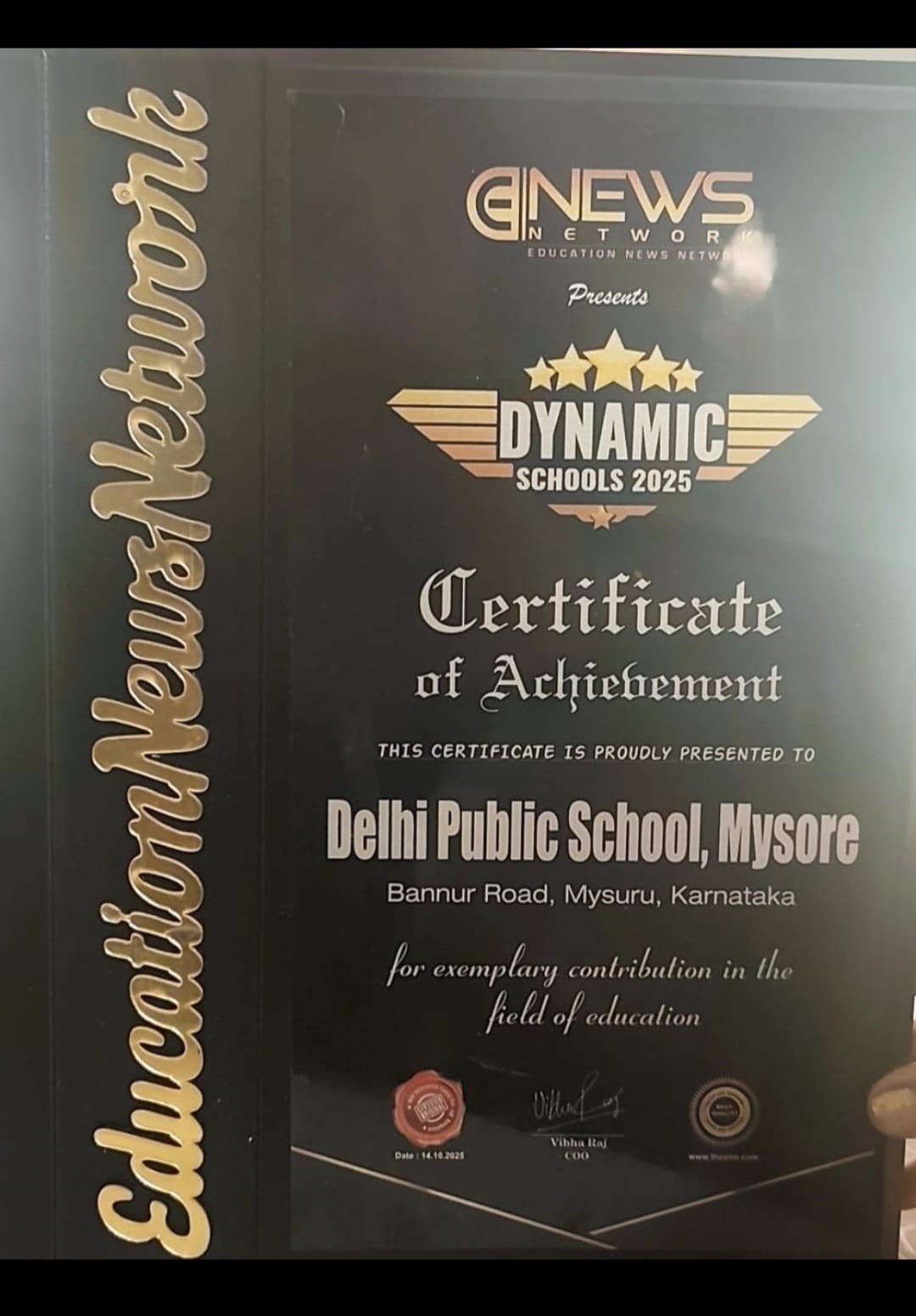 Delhi Public School, Mysore is honored to have receive a Certificate of Achievement as a ‘Dynamic School’ 2024 by the Education News Network in collaboration with Education Today. The visionary leadership, inclusive approach and dedication to student success of our management under KKECT, has truly set our school apart and helped us achieve this milestone.